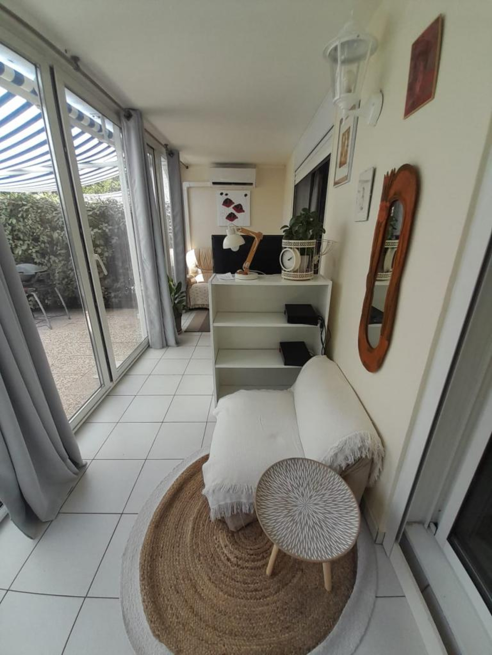 Il est composé d'une entrée, une salle d'eau à l'italienne, un WC indépendant, un séjour-cuisine, une cabine avec lits superposés, une chambre et une loggia avec accés à la terrasse et au jardin.